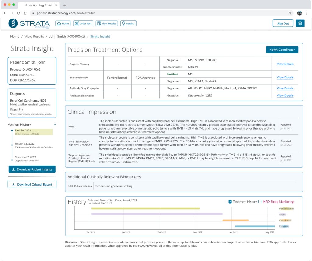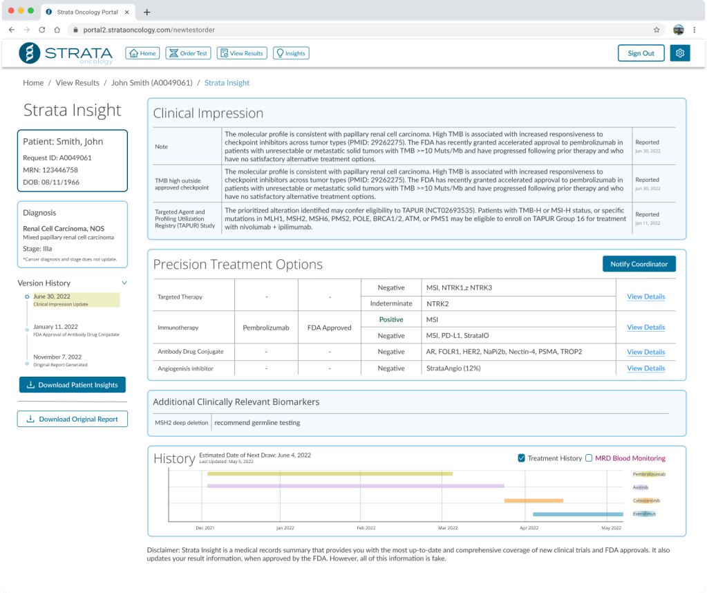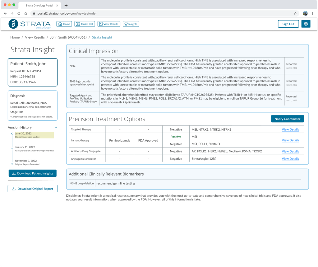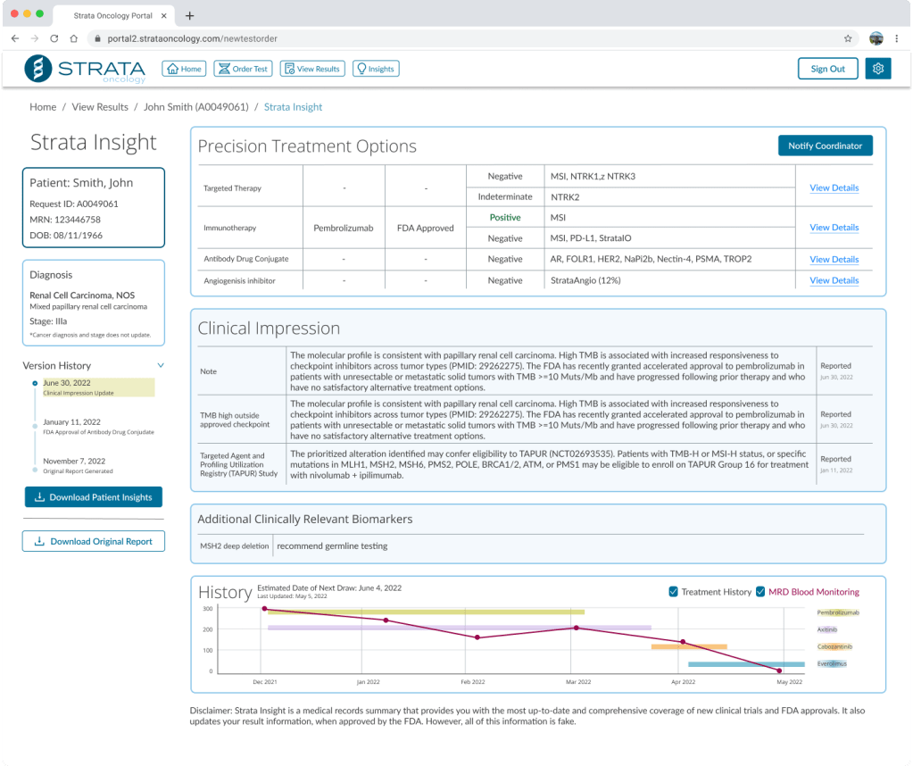 With Insight, a dynamic report would share this information for each patient that received testing through Strata. Anytime a new trial became available. The associated physician would be notified, and the patient’s report data would be updated.