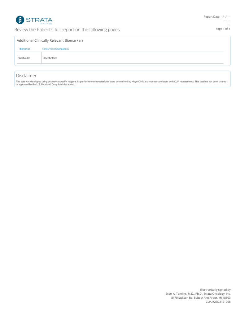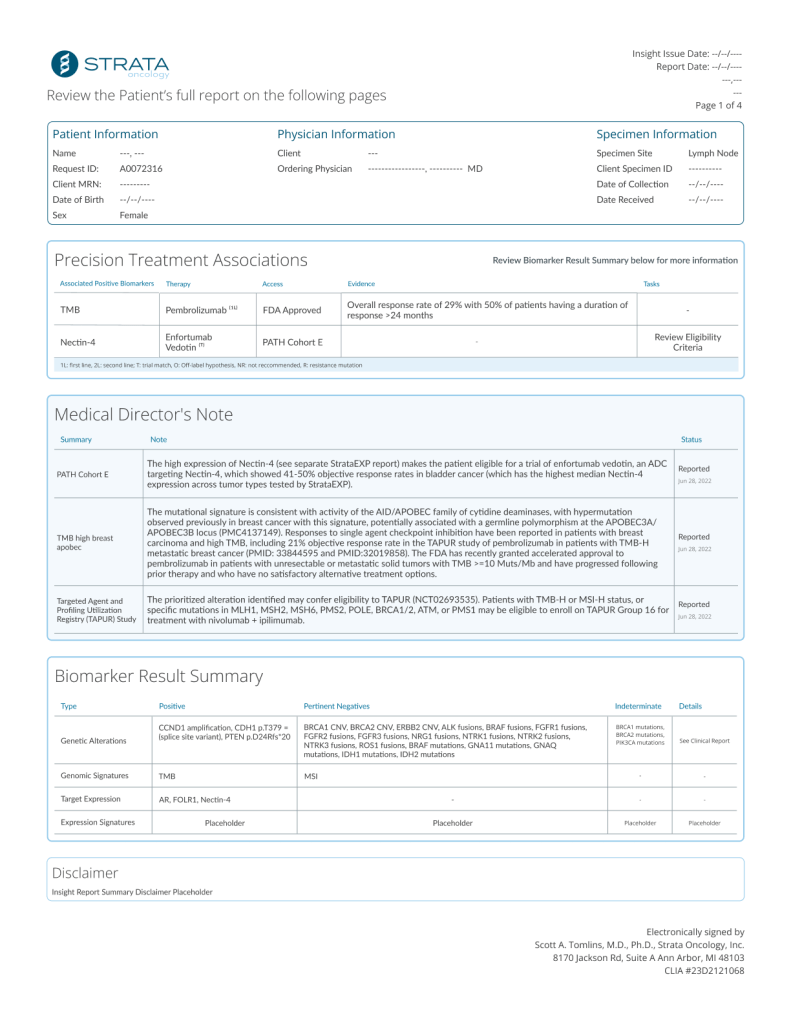 The intention of Insight is to bring the most updated information to any patient that received our testing. As part of Strata’s testing, the report shares a collection of clinical trials available to the patient based on their biomarker results. Cancer care is constantly improving, therefore, the list of clinical trials and therapy recommendations for a patient are too.