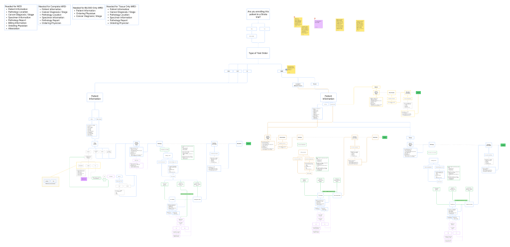 Once I had completed this deep dive, I compiled all of my data and began work on the initial user flows. This step helped me to establish the information that we needed to collect from each order based on the test they were trying to order, our relationship to their billing department, and what patient information was available to the clinical staff placing the order.